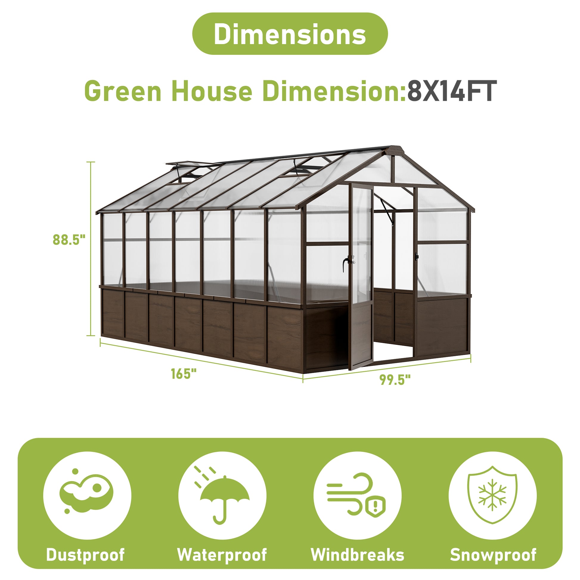 NETAJE 8'x14' Outdoor Wooden Greenhouse, Heavy Duty Walk in Polycarbonate Greenhouse with Ventilated Window, Locked Door and Roof Vent for Patio, Garden, Backyard, Brown