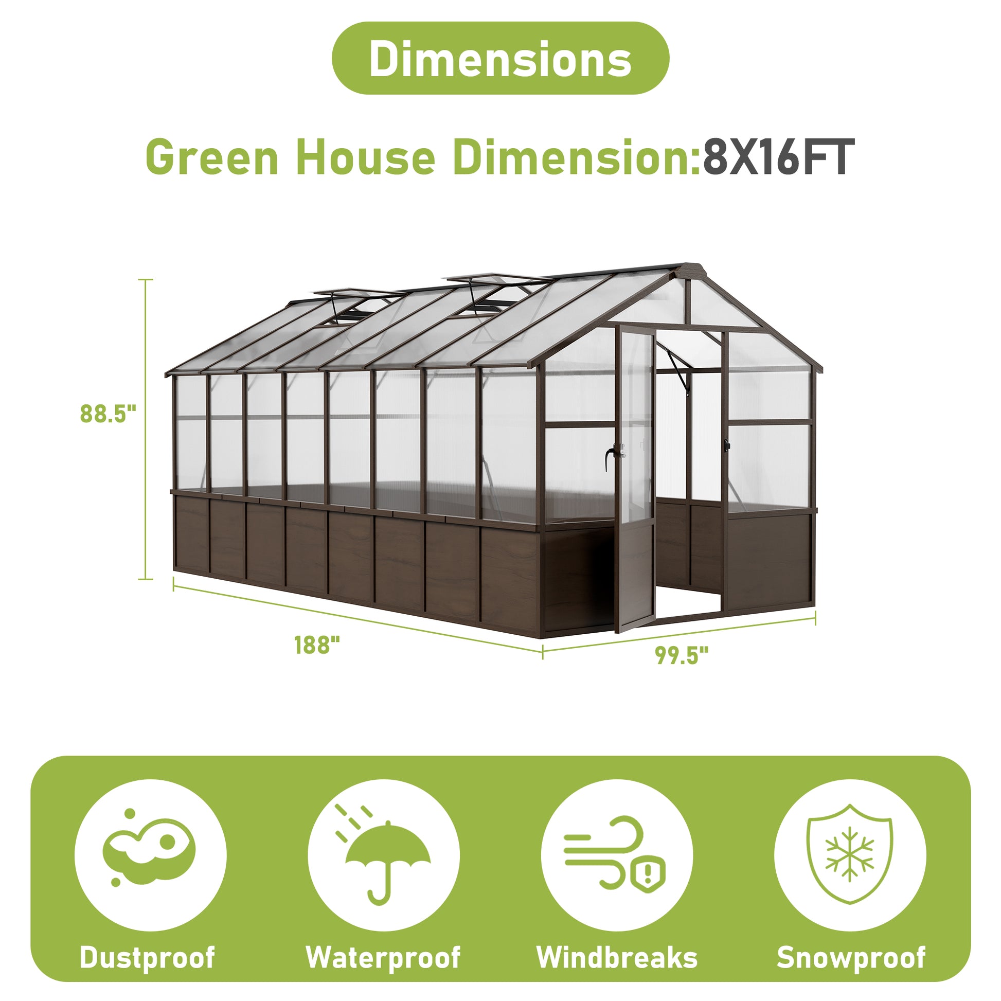 NETAJE 8'x16' Outdoor Wooden Greenhouse, Heavy Duty Walk in Polycarbonate Greenhouse with Ventilated Window, Locked Door and Roof Vent for Patio, Garden, Backyard, Brown